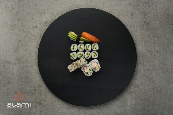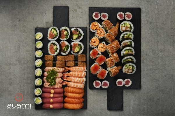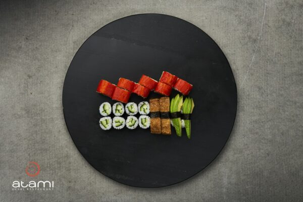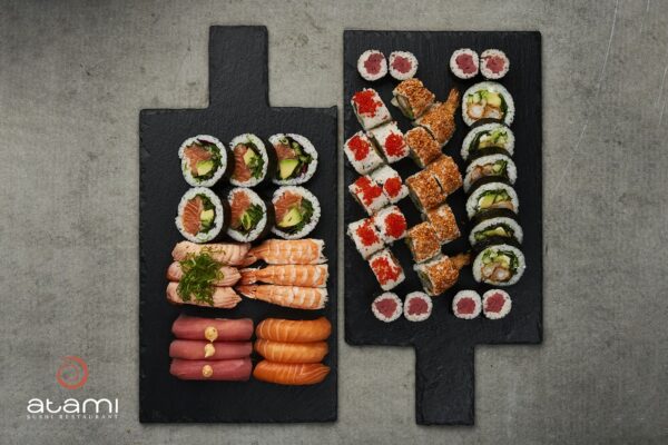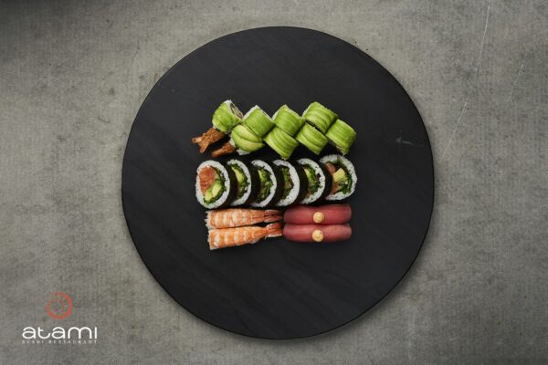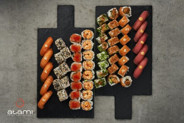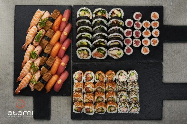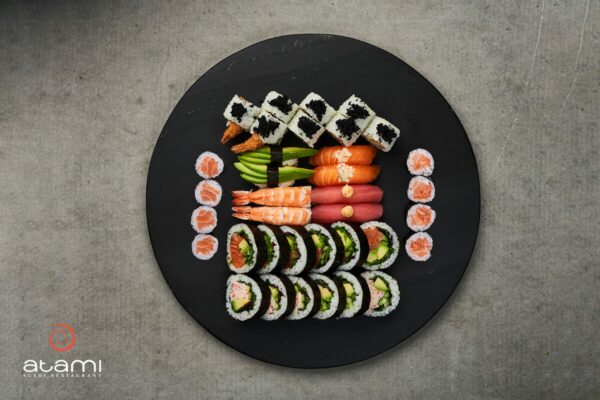 (83stk.) 1 Hosomaki laks (8 stk.), 1 Hosomaki tun med forårsløg (8 stk.) 1 Califonia (8 stk.), 1 Spicy laks (8 stk.), 1 Hot ebi (8 stk.) 1 Store Laks roll (6 stk.), 1 stor Tempura roll (6 stk.), 1 Stor Kylling roll (6 stk.) 5 Nigiri laks, 5 Nigiri tun, 5 Nigiri reje, 5 Nigiri tofu, 5 Nigiri lakstataki.