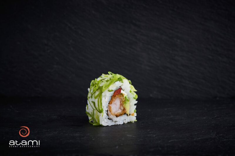 Tempura reje, Avocado, Rød peberfrugt, Forårsløg, Chilimayonnaise og Flødeost. (8 stk.)
